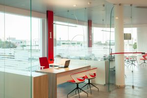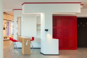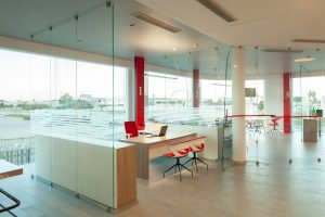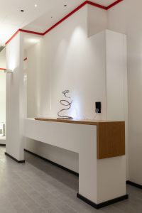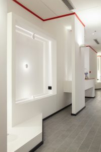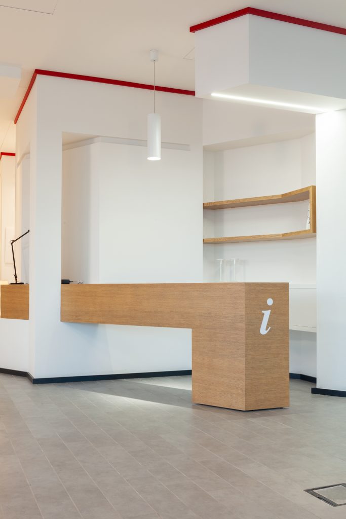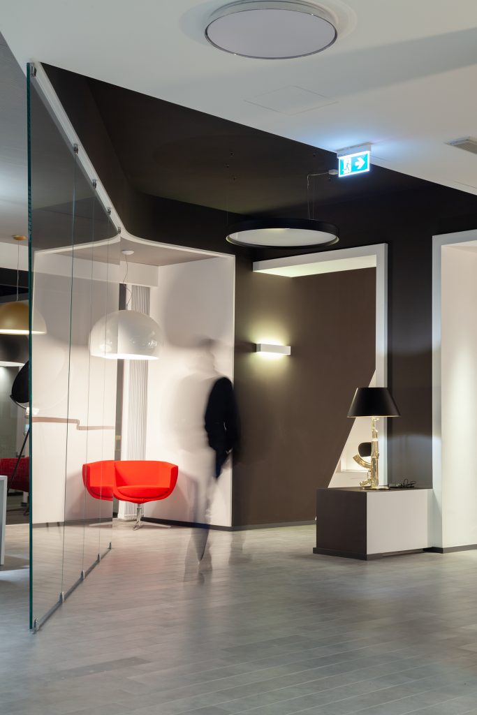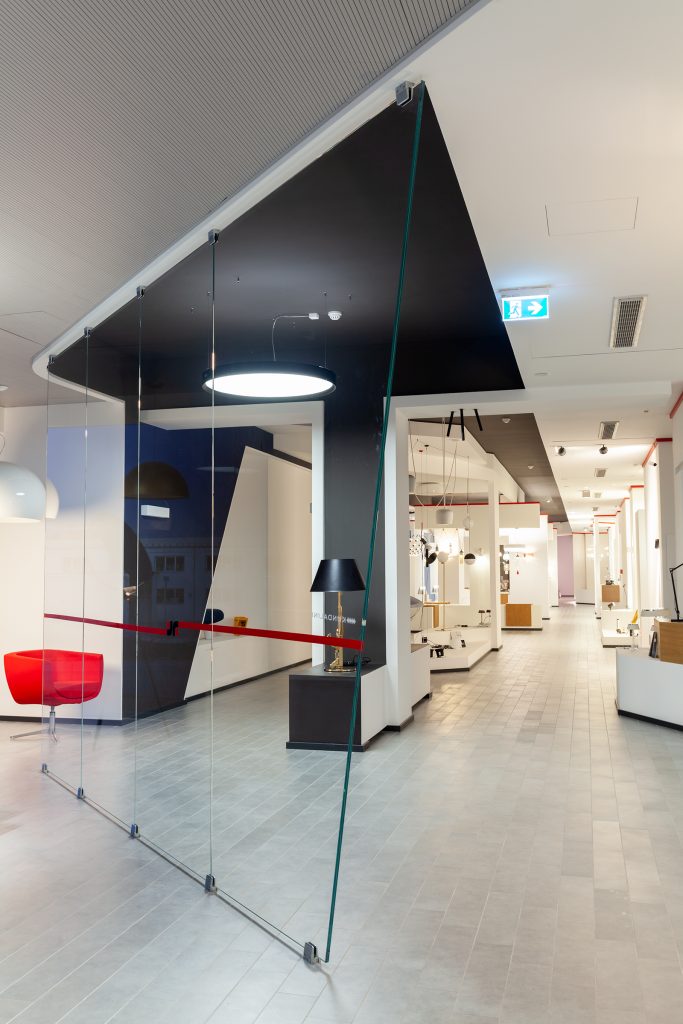 Questo ha permesso di concepire lo showroom come una vera e propria promenade espositiva, preceduta dalla zona d'ingresso dotata di reception e area di accoglienza, oltreché dagli uffici, schermati da pareti vetrate a tutta altezza ed esclusivamente dedicati ai clienti dello showroom.